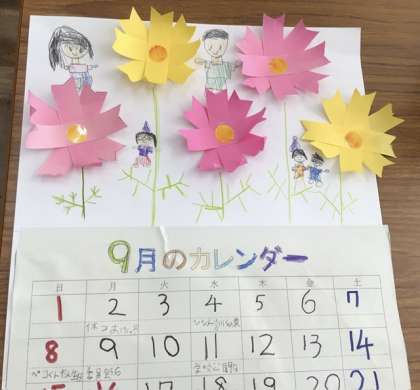 9月は秋の花コスモス畑で遊ぶ子どもたちをテーマにカレンダーを作りました。