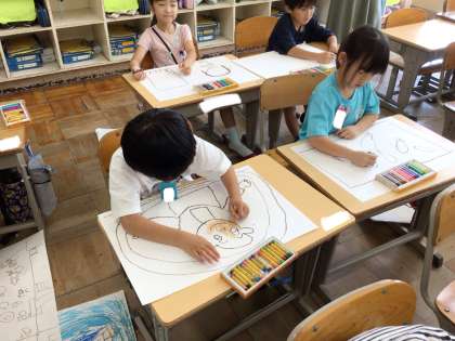 夏休みにしたことを思い出して、画用紙にクレヨンでかきました。 丁寧に色塗りをすることができました。