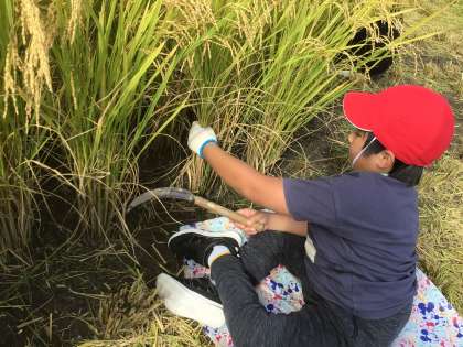 特別支援学級の5年生も交流しているクラスの友達と一緒に稲刈りをしました。