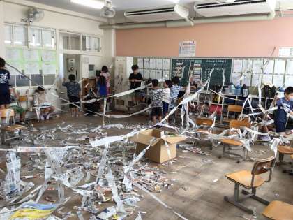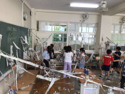 「つないで つるして」の授業で、新聞や広告を教室中につなげたりつるしたりしました。