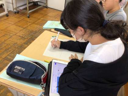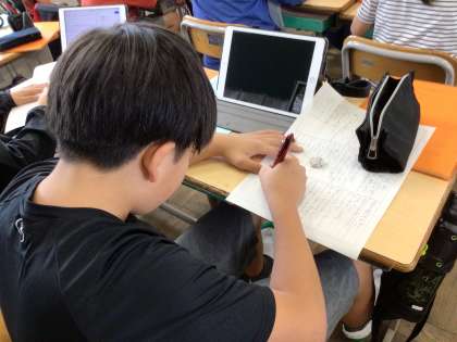 修学旅行のまとめとして、現地で書いたメモやもらったパンフレット等をもとに、まとめの新聞を作っています。