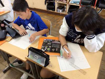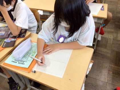 修学旅行のまとめとして、現地で書いたメモやもらったパンフレット等をもとに、まとめの新聞を作っています