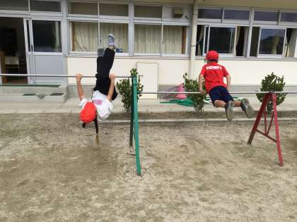体育の学習では、なわとびと鉄棒をしています。いろいろな技に挑戦しています。