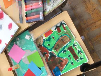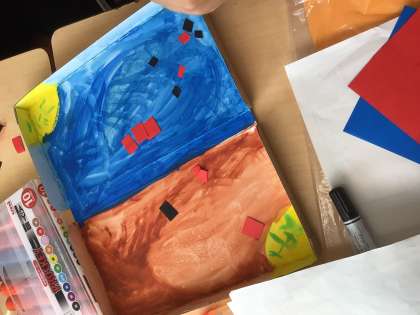 「わくわくおはなしゲーム」の学習で、おはなしすごろくを作っています。お話にあった特別マスを考えたり、コースを工夫したりしています。出来上がりが楽しみです。