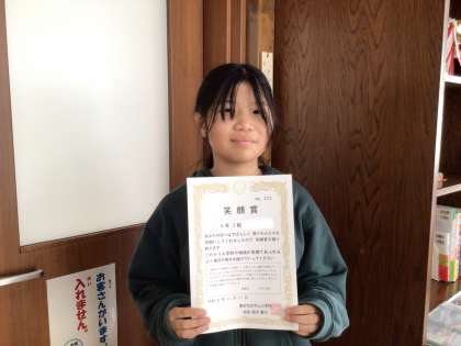 472.473.474号 公開日 2024/11/11 更新日 2024/11/11 笑顔賞 472:運動会の応援団に立候補して、みんなの前で大きな声が出せるように、前向きに練習する姿がすてきです。 473:毎日のスマイル学習では、一斉テストに向けての学習をこつこつ取り組むことで、テスト結果に成果が見えるようになってきました。 474:算数の授業では、一つの問題にいろいろな角度から考えることができ、自分が見つけた考え方を周りに伝えることができています。