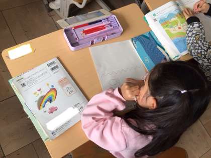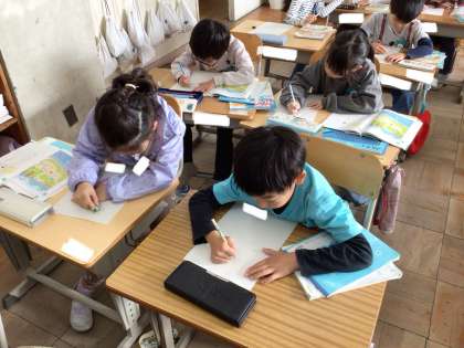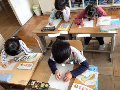 点と点を線でつないで、いろいろな形を作りました。色を塗って車や船など上手にかいていました。