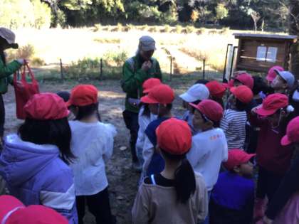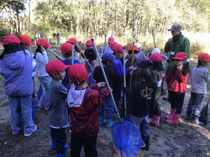 田んぼにいるヤゴを捕まえるための説明を聞いています。