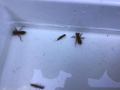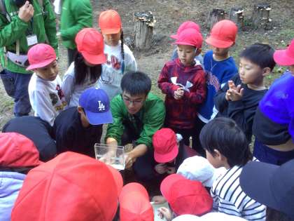 捕まえた生き物を観察しています。