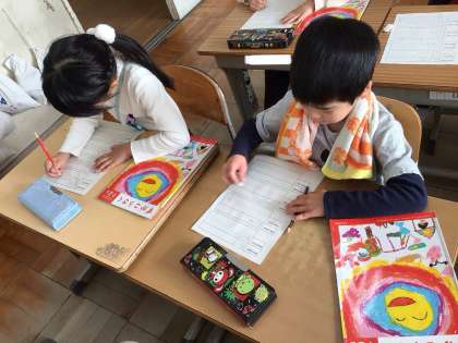 1年生 図画工作科 公開日 2024/12/04 更新日 2024/12/04 各学年から 「さわりごこち はっけん」 外にあるもの、教室にあるものを手で触って、いろいろな触り心地があることを発見しました。紙にまとめて友達に発表しました。