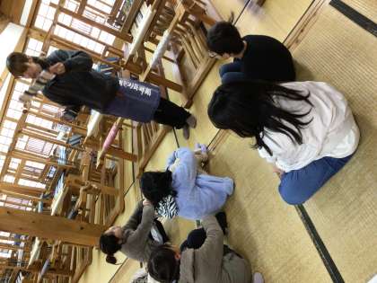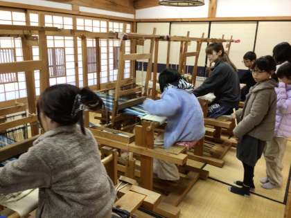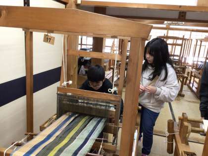 機織り機でコースター作りをしました 三人で協力して素敵な作品ができました。