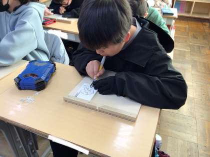 卒業制作のオルゴールボックス作りが始まりました。まずは、彫刻刀の種類と使い方を確認しました。