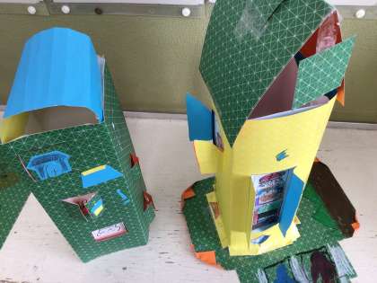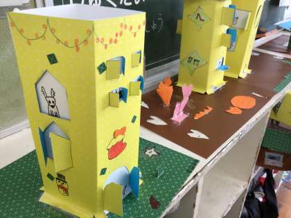 2年生 図画工作 公開日 2025/01/15 更新日 2025/01/15 各学年から 図画工作「まどからこんにちは」の作品が出来上がってきました。ドキドキしながらカッターナイフを使って切り開いた窓からは、いろいろな世界が広がっています。