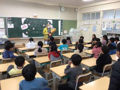 1月まで担任をしてくださった可知井先生が最後に学校に来る日でした。2年4組の子どもたちは全員で花束を渡してお礼の言葉を伝えることができました。中には寂しくて涙が出てしまう子も。最後は全員と握手をしてお別れしました。
