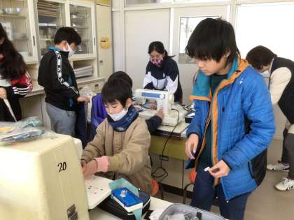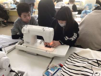 家庭科でエプロンを縫っています。互いにサポートし合いながら、作っている様子が印象的でした。
