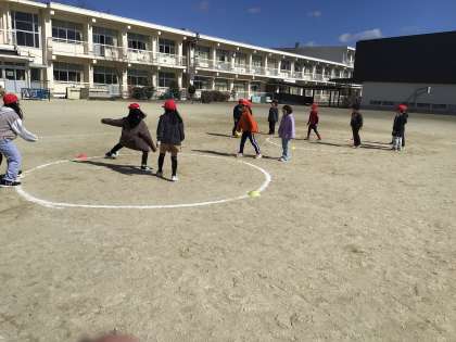 体育で「ボールけりあそび」の学習をしています。今日は、「たまごわりサッカー」という遊びを楽しみました。