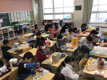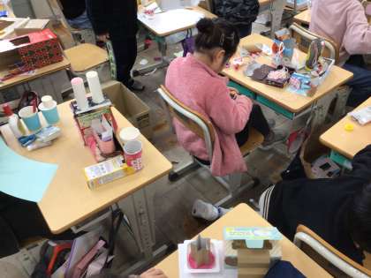 2年 図工 公開日 2025/03/04 更新日 2025/03/04 各学年から 空箱を使って、可愛らしい家がたくさんできました。子どもたちの想像力には大人も驚かされます。保護者の皆様、ご協力ありがとうございました。