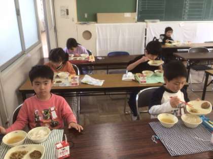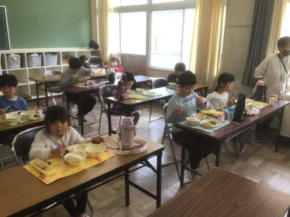 新入生を迎え、新たな仲間と給食を食べています。