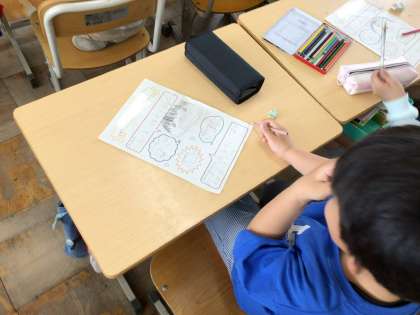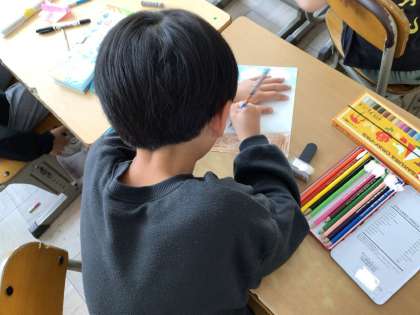 図工では春のスケッチを画用紙に描きました。 自己紹介カードに似顔絵をかきました。