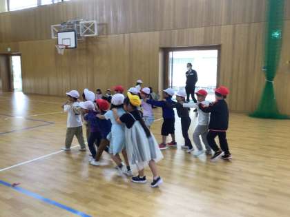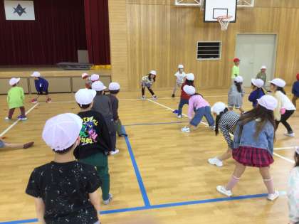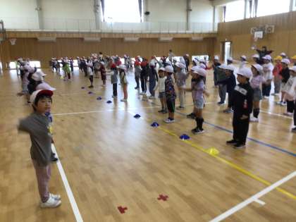 体育館でじゃんけん列車などをして体を動かしました。