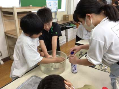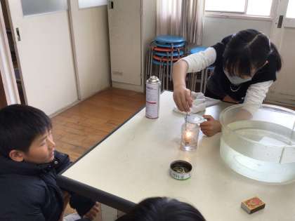 窒素、酸素、二酸化炭素の3種類の気体の中で、ろうそくの火がどうなるか実験して確かめました。