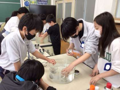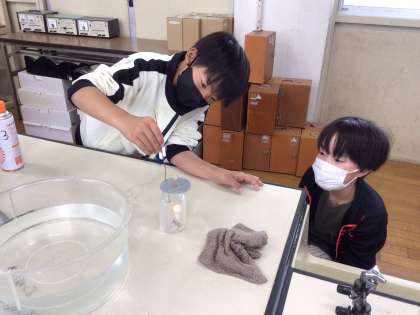 窒素、酸素、二酸化炭素の3種類の気体の中で、ろうそくの火がどうなるか実験して確かめました。