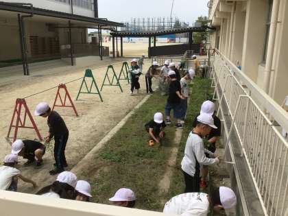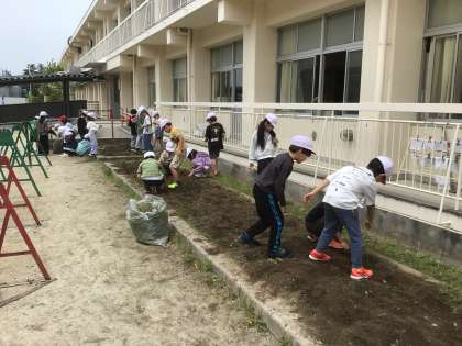 理科でひまわりとホウセンカを植えるために畑の草取りをして畑を耕しました。来週、タネを植えます。