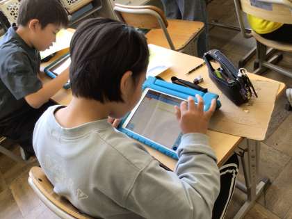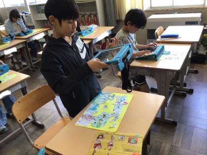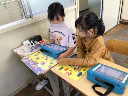 4年 図画工作 絵の具でゆめもよう 公開日 2025/05/01 更新日 2025/05/01 各学年から 絵の具技でつくったもようを使って、自分だけの世界をつくりました。できあがった作品をタブレットで共有しました。
