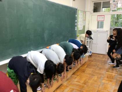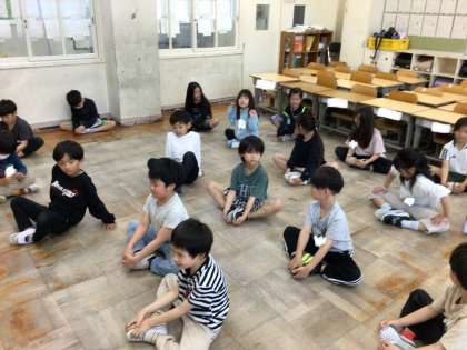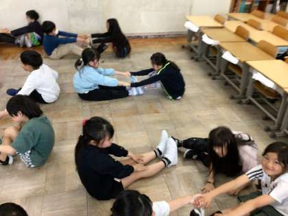 2年体育 柔軟体操 公開日 2025/05/02 更新日 2025/05/02 各学年から あいにくの雨模様のため、教室で柔軟体操に取り組みました。 いつもの柔軟体操や前屈、V字バランスにも取り組んでみました。
