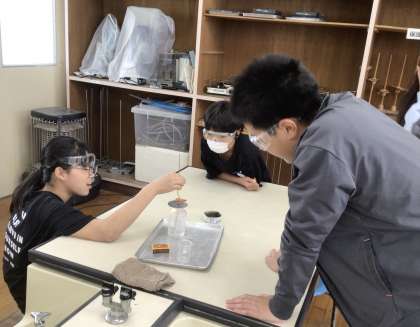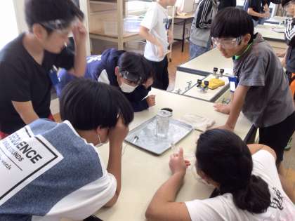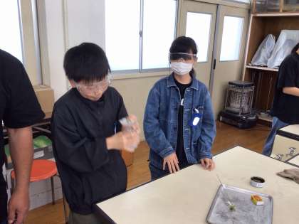 燃える前と燃えた後で、瓶の中の空気がどのように変わるか、石灰水を使って調べました。