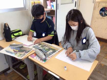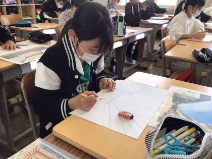角度や距離を意識しながら、思い出の校舎の下描きをしました。