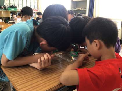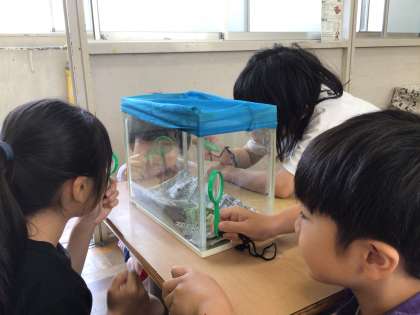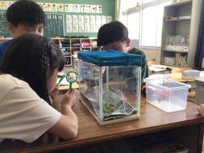 理科の授業では、アゲハの幼虫とモンシロチョウのサナギの観察をしました。興味津々な様子で良い学びになりました。
