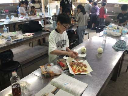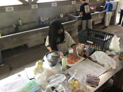 食材担当です。事前に調理実習を行ったので、どの班も手際よく進めています。