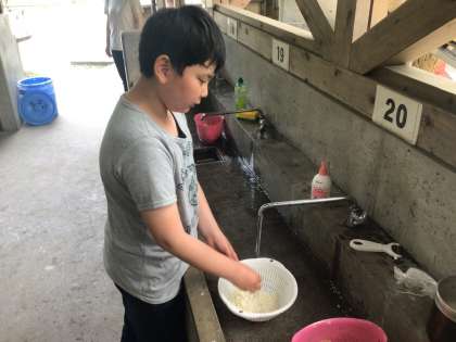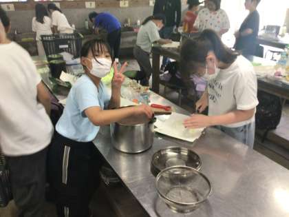 食材担当です。事前に調理実習を行ったので、どの班も手際よく進めています。