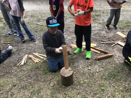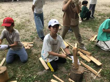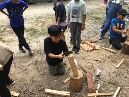 かまど担当です。なたを使ってまき割りをしています。
