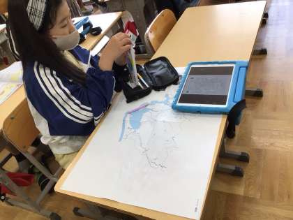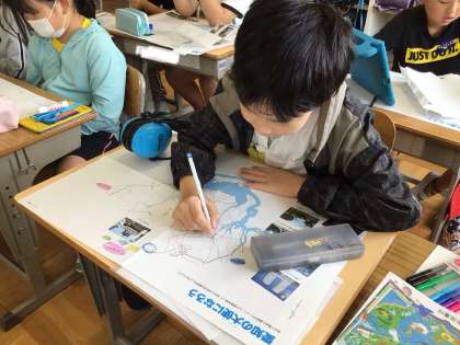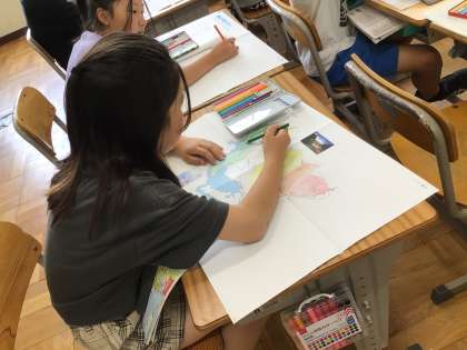 愛知県の特徴を白地図に書き落とし、自分だけの愛知県地図を作成しています。