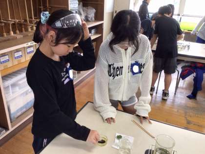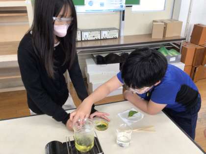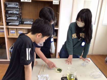 日光に当てると葉にデンプンができるかどうか、ヨウ素液を使って調べました。
