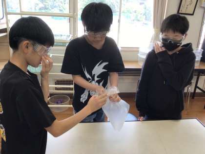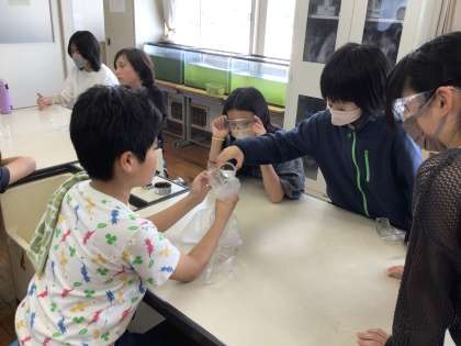 空気を吸ったり吐いたりするとき、何を取り入れて何を出しているのか、石灰水や気体検知管を使って調べました。
