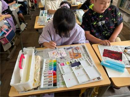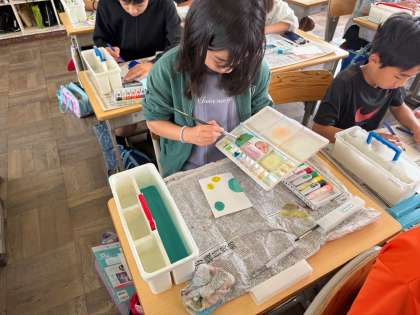 「心のもよう」の学習で、絵の具を使って感情を色や模様で表しました。