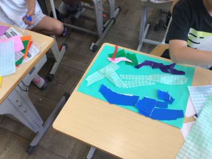 図画工作「やぶいたかたちから うまれたよ」の学習で、〇〇の世界をつくりだしています。