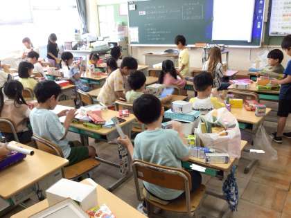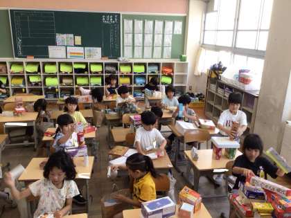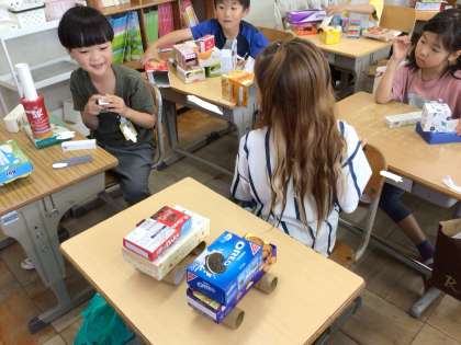 算数の授業で箱の形を生かして、動物や乗り物を組み立てました。