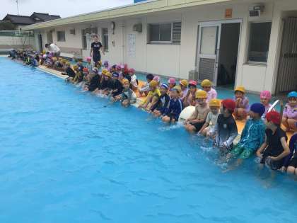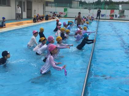 9日から水泳学習が始まりました。水に慣れたり、みんなでプールの中を歩いたりしました。