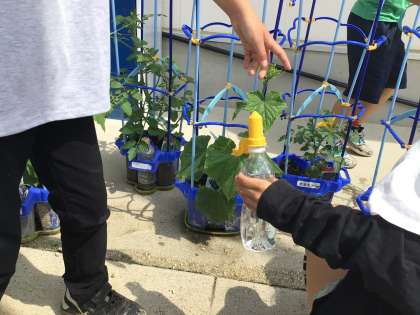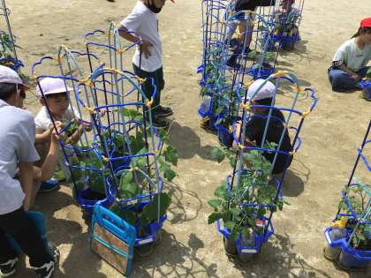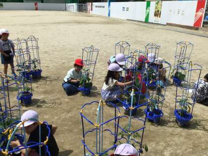 野菜の成長が著しいです。 支柱にビニールひもでくくりつけて、まっすぐ伸びるようにアシストします。
