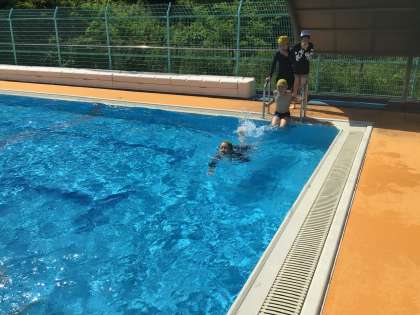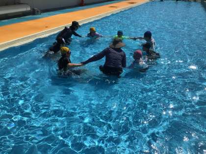 中級のラッココースは伏し浮きや蹴伸びをして、水に浮かぶ感覚を楽しみました。