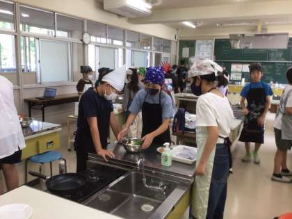 7・8・9組 美味しい青菜炒めが作れましたー6年家庭科ー 公開日 2025/06/26 更新日 2025/06/26 各学年から 6年生が家庭科の調理実習で、青菜炒めを作った時の様子です。 班の子達と役割分担をし、協力して調理をすることができました。 上手に味付けもでき、とても美味しかったそうです。 家庭でも実践して家族に振る舞えるといいですね。