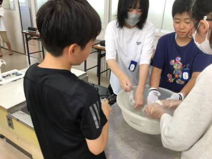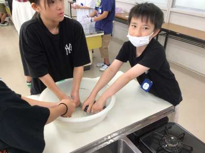 7・8・9組 手洗いって大変!ー6年家庭科ー 公開日 2025/07/15 更新日 2025/07/15 各学年から 6年生が家庭科では「夏を涼しくさわやかに」の単元で 洗濯について学習しています。 今回は、靴下の汚れを手洗いで落とす実習に取り組みました。 手洗いで汚れを落とすのはなかなか大変な作業です。 今回の学習で、家事の大変さや洗濯機の便利さに気づけたのではないでしょうか。