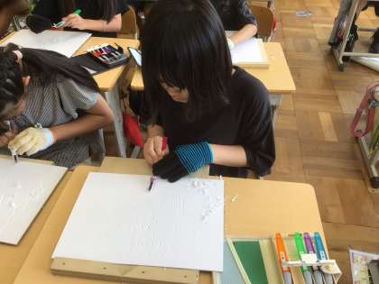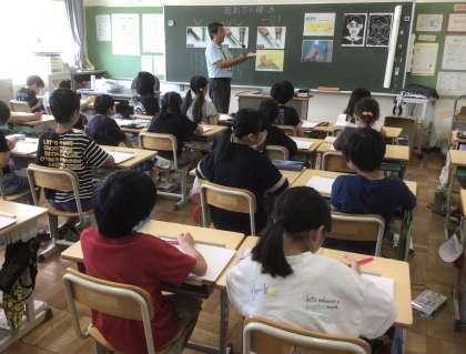7・8・9組 彫刻刀に挑戦!ー4年図工ー 公開日 2025/07/09 更新日 2025/07/09 各学年から 4年生が図工の学習で、木版画に挑戦します。 木版画を制作するには、彫刻刀が必要、ということで 初めて彫刻刀を使います。 そこで、正しく安全に彫刻刀が使えるように 彫刻刀教室を行いました。 講師の先生の話をしっかり聞いて 正しく彫刻刀を使い、板を掘り進めることができました。