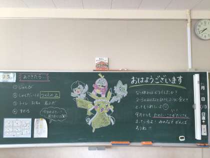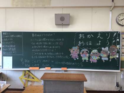 楽しい絵を黒板に描いて、子どもたちをお出迎えしました。9月からも子どもたちと楽しく学校生活を送ります。