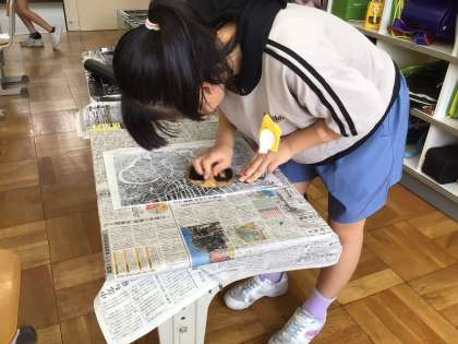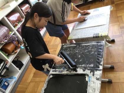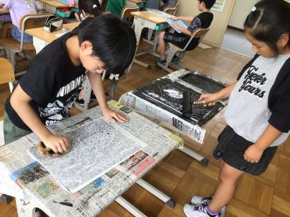 夏休み前に彫った作品にインクを付けました。次回から色を付けていきます。
