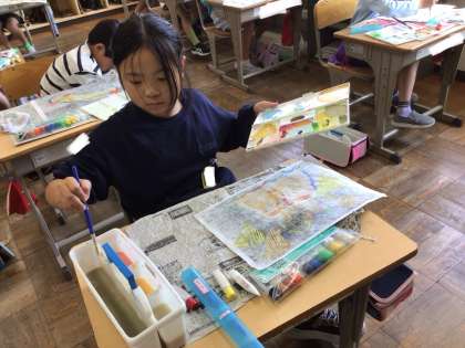 刷った版画に裏から色を付けていきます。完成が近づいてきました。