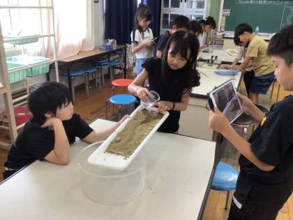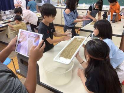 小さい川を作って、水を流し、どのように流れていくのかを観察しました。